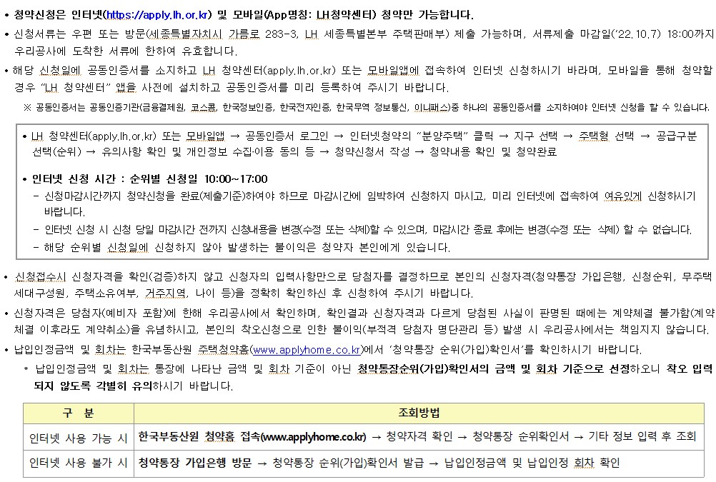 ※ 계약체결장소 : LH 세종특별본부 주택판매부(세종특별자치시 가름로 238-3)