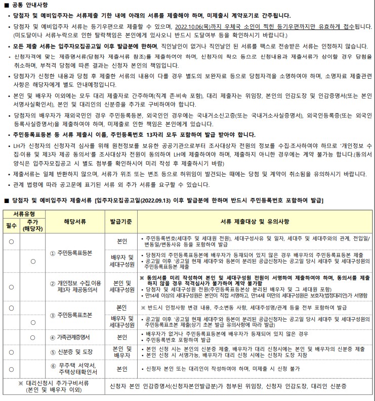 ■ 아래의 계약서류는 입주자모집공고일(2022.09.13) 이후 발급분에 한하며, 계약서류 중 1건이라도 미비 시에는 계약이 불가합니다.