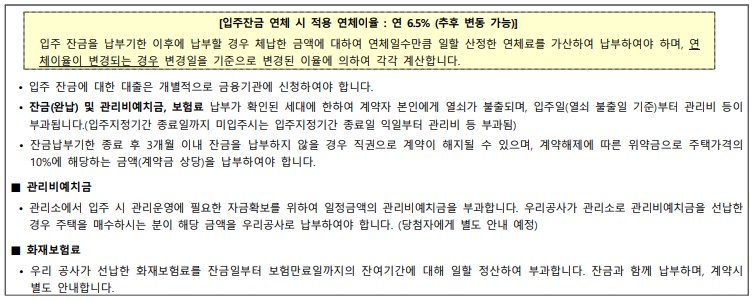 • 선납 시 할인은 적용되지 않으며, 상기 기한까지 입주 잔금을 납부하지 않을 경우 연체일수에 따라 소정의 연체이율을 적용하여 산정한 연체료가 부과됩니다.