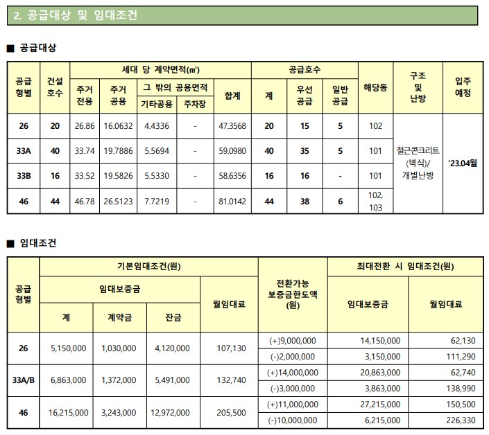 창녕말흘 국민임대주택 26㎡의 임대조건은 임대보증금 5,150,000원에 월 임대료 107,130원이며 33㎡A/B는 임대보증금 6,863,300원에 월임대료 132,740원입니다. 마지막으로 대신 46㎡형은 임대보증금 16,215,000원이며 월임대료 205,500원입니다. 추가로 월임대료를 보증금으로 전환가능하며 추가납부한도가 있습니다.