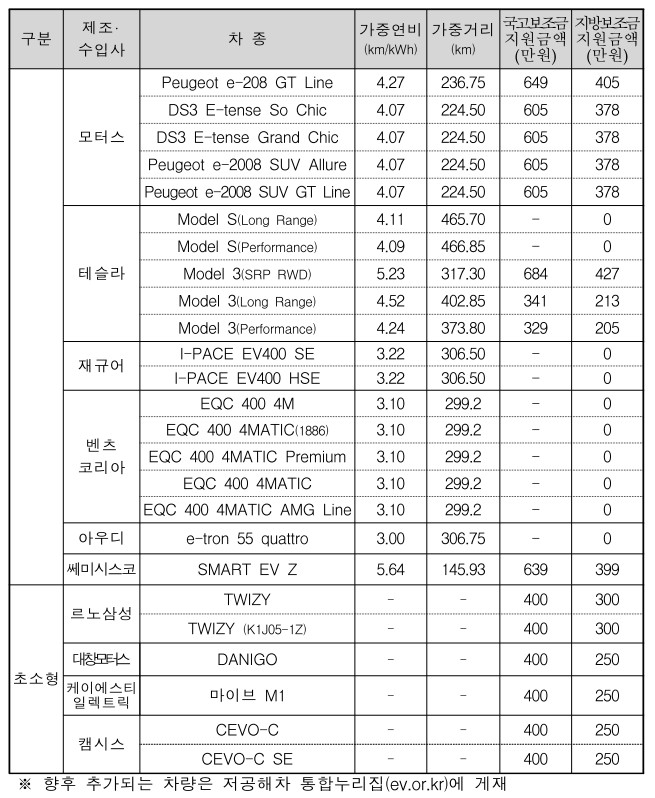 ㅇ 차종별 보조금 : 〔붙임 1〕 2020년 전기자동차 보조금 지원대상 현황 및 환경부 저공해차 구매보조금 지원시스템(ev.or.kr) 참조