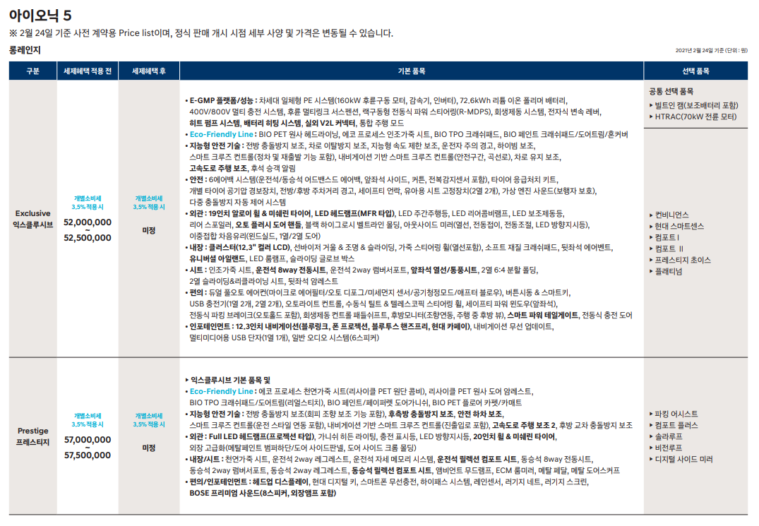아이오닉5 하위트림인 익스클루시브가 개소세 3.5% 적용시 5200만원이고 상위트림인 프레스티지가 5700만원이 기본가격입니다. 개소세는 감면 혜택이 오는 2022년까지 연장 되었으므로 일단 제시 가격에서 3.5%는 낮게 생각하면 됩니다.아래 가격표에서 보시듯이 아직 미정인 옵션가를 얼마나 책정할지 모르겠지만 5999만원을 안넘어 가지 않을까 생각해봅니다.