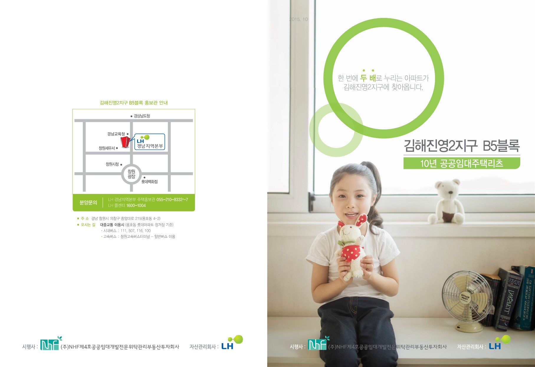 | ❚공급위치 : 경상남도 김해시 진영읍 김해대로 461 센텀큐브 (김해진영2 B5블록) ❚공급대상 : 예비입주자 84A1 30세대, 84A2 10세대, 84A3 2세대, 84B1 10세대 (총 52세대) ❚시 행 사 : ㈜NHF제4호공공임대위탁관리부동산투자회사 ❚자산관리회사 : 한국토지주택공사[LH] |