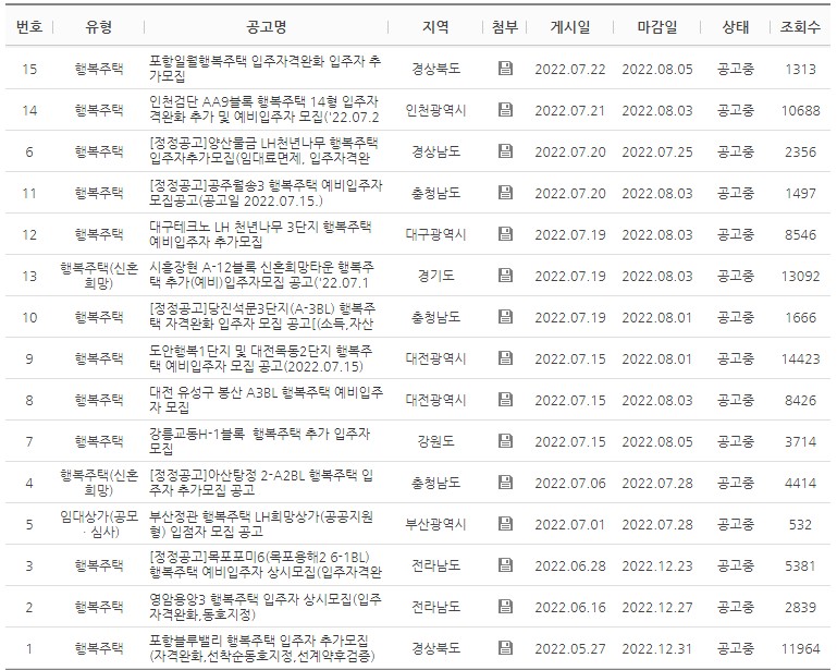 현재 모집중인 공고를 살펴보면 서울은 없고 인천광역시 경상남북도 경기도 충청남도 대전 대구 부산 전라남도등에서 모집중입니다. 해다 신청기일을 잘 보시고 필요하신분들은 각 공고문 내에 신청방법이 잘 설명되어 있습니다. 대부분 인터넷 및 모바일로 신청이 가능하며 노약자를 위하여 방문신청도 받고있습니다.