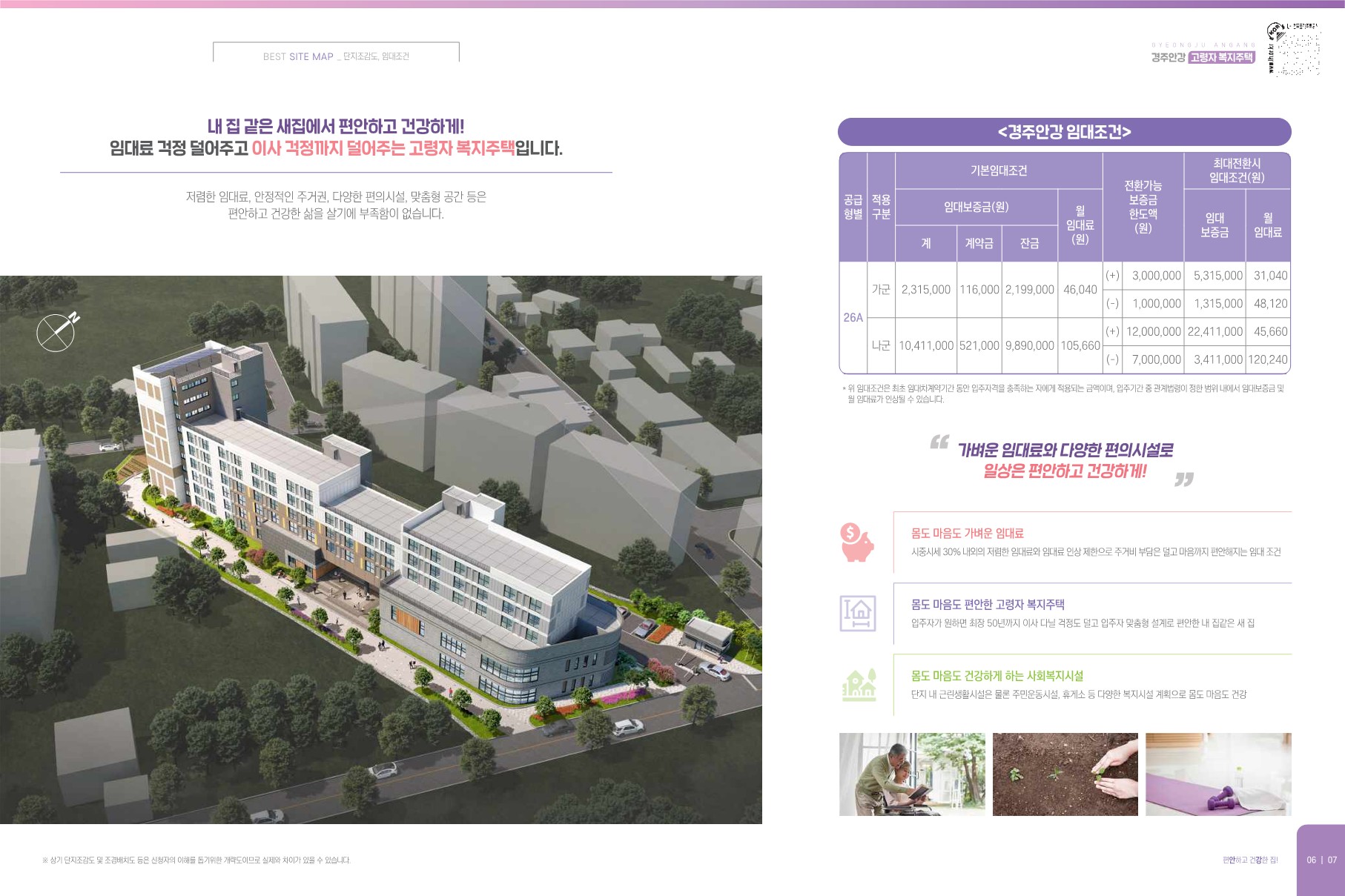 | 고령자복지주택은 무장애 설계를 적용하여 고령자용 맞춤형 임대주택과 복지서비스를 함께 제공하는 주택입니다. |