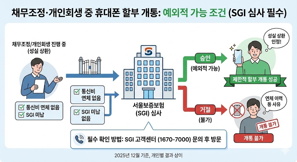 - 채무조정 중: 서울보증보험 심사 통과 시 1~2회선 제한적 개통 가능