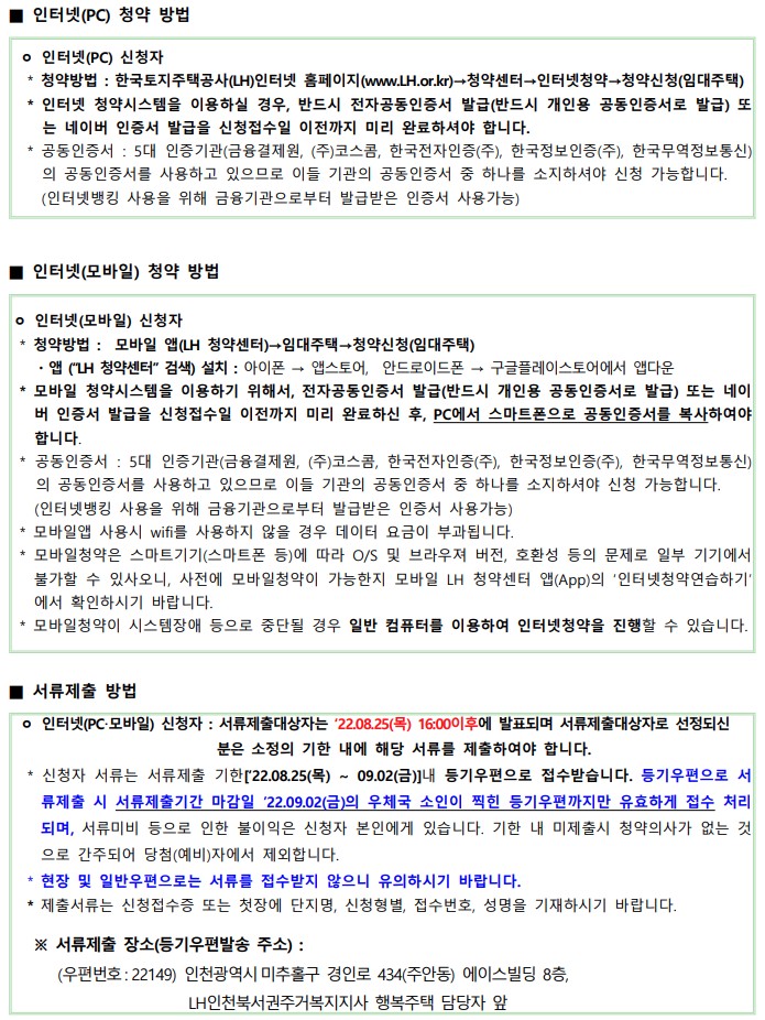 '22.08.25(목) 〜09.02(금) [등기우편] (9.2우체국소인분인정) ※서류제출 주소 인천 미추홀구 경인로 434 LH인천북서권 주거복지지사 8층 |