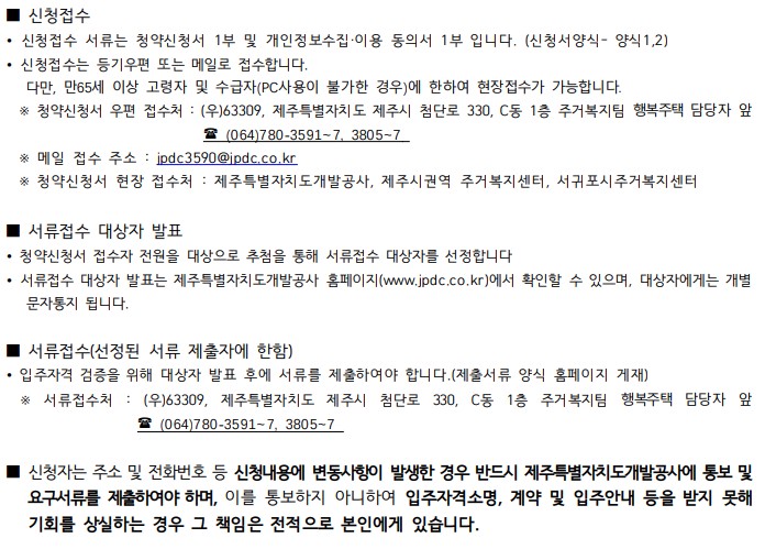 | 문의 | •문의처 : 064-780-3591~3597, 3805~3807 •인터넷 : 제주특별자치도개발공사 홈페이지 (http://www.jpdc.co.kr) •유선상담 시 의사소통 간 문제로 입주자격 등을 정확히 파악하지 못 할 경우가 있으니 상담내용은 참고용으로만 활용하시기 바랍니다. •주거급여수급자 및 고령자 계층 중 우편·메일 접수가 어려운 경우만 현장접수 가능하며, 그 외 계층은 현장접수가 불가합니다. |