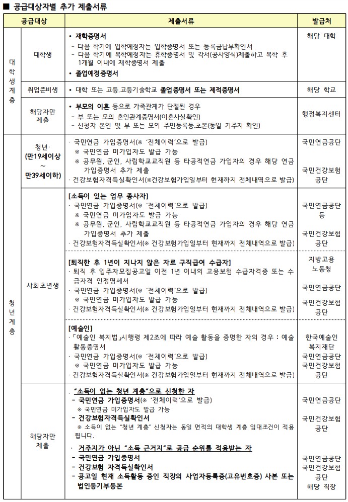 • “청년계층”은 소득유무에 따라 임대조건이 달라지며, 임대조건은 재계약전까지 유지되며 재계약시 소득 유무에 따라 변경된 임대조건을 적용합니다.