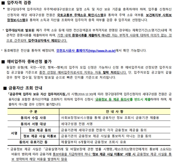 | 문의처 | ․ 인천광역시청 및 인천시 관내 읍·면·동 행정복지센터 (평일 09:00 ~ 18:00) ․ 인천도시공사 ☏ 1522-0072 (평일 09:00 ~ 18:00) |