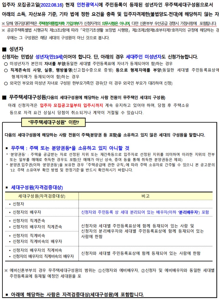 | ※ 금회 모집하는 주택의 입주자 모집공고일은 2022.08.16(화)이며, 이는 입주자격(무주택세대구성원) 및 배점 등의 판단 기준일이 되며, 제출서류는 모집공고일 이후 발급분이어야 합니다. ※ 신청접수는 인터넷 신청이 불가능하고, 지정된 일자에 인천광역시 관내 거주지 관할 행정복지센터에서 현장접수 만 가능합니다. ※ 본 단지는 영구임대(355호)와 행복주택(754호), 별도공급의 혼합단지로. 입주시기는 ‘23년 2월 예정이며 공사진행에 따라 입주일정이 다소 지연 등이 발생할 수 있습니다. ※ 행복주택은 별도의 입주자 모집공고를 통해 공급합니다. ※ 1세대(무주택세대구성원 전원) 1주택 신청을 원칙으로 하며, 중복신청하는 경우에는 전부 무효처리 합니다. (신청을 원하시는 1개단지, 1개 평형만 신청 가능합니다.) |
