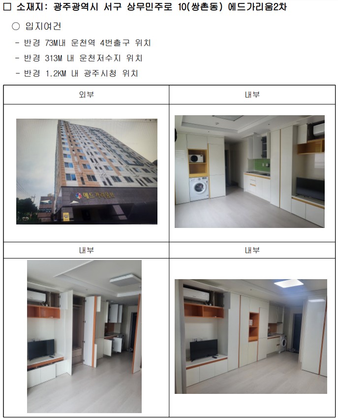 | ① 광주광역시 서구 상무민주로 10 에드가리움 2차 오피스텔(쌍촌동 968-3번지) ① 광주광역시 서구 상무민주로5번길 9 포레스힐1 (쌍촌동 970-6번지) |
