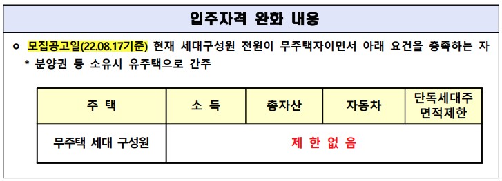 모집공고일(2022.08.17) 현재 성년자인 무주택 세대구성원(단, 신청자격은 모집공고일로부터 입주시까지 계속 유지하고 있어야 하며