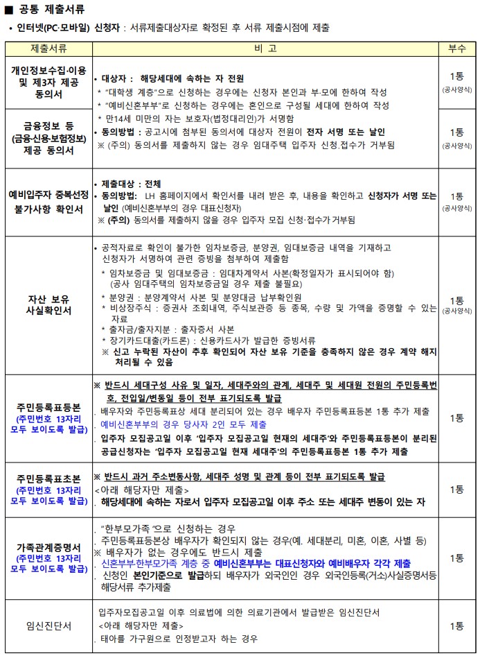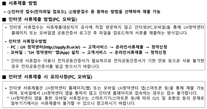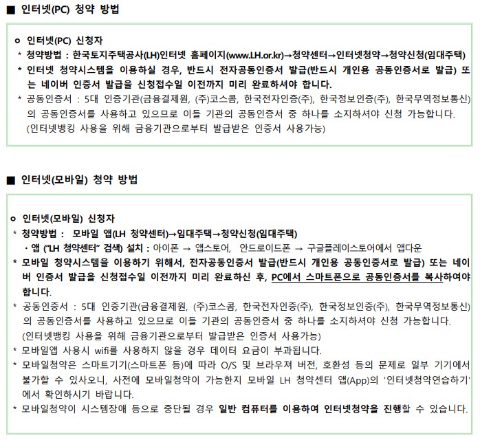 | 인터넷 청약 | ‧ PC : LH 청약센터(http://apply.lh.or.kr) → 인터넷청약 → 청약신청(임대주택) ‧ 모바일 : “LH 청약센터“ 앱(App) 설치 → 임대주택 → 청약신청(임대주택) |