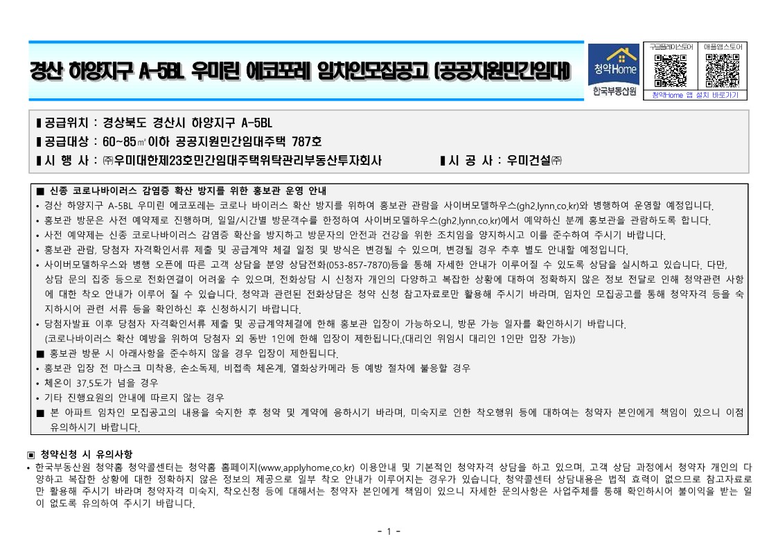 경산 하양지구 A-5BL 우미린 에코포레 임차인모집공고 (공공지원민간임대) ✔ 신혼부부 청년 특별공급 ✔ 임대기간 10년 이상 임대조건 등