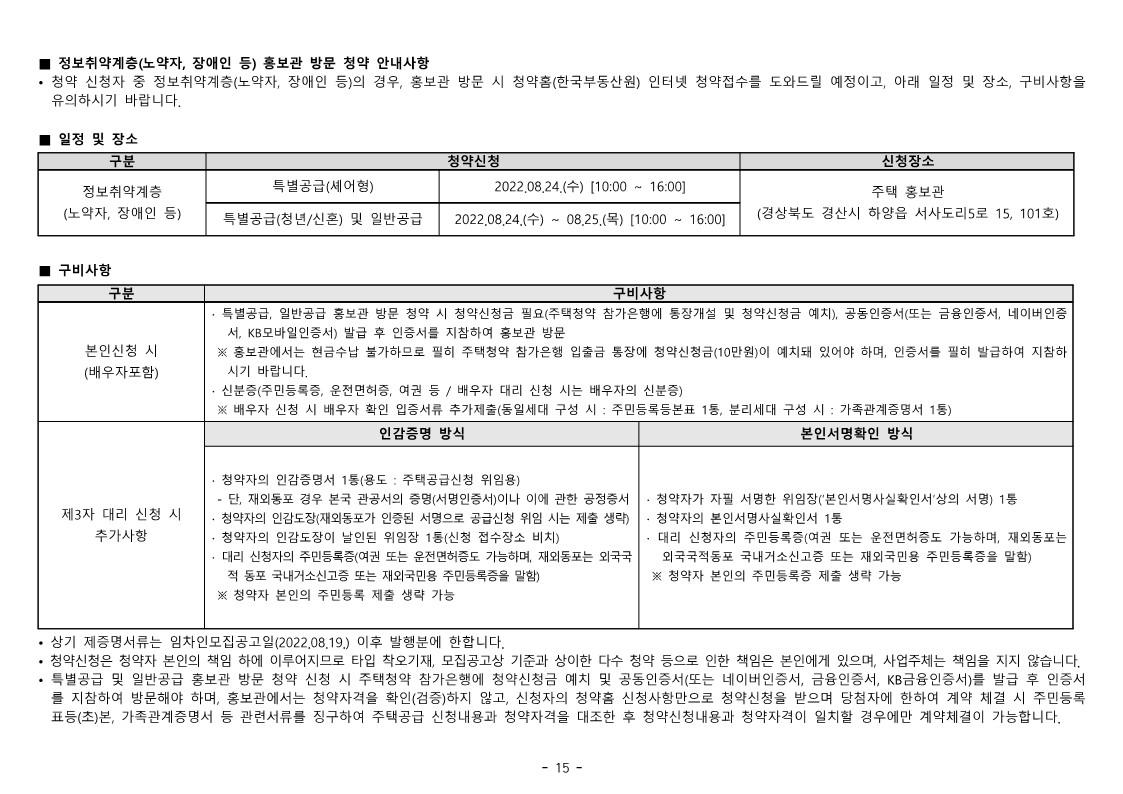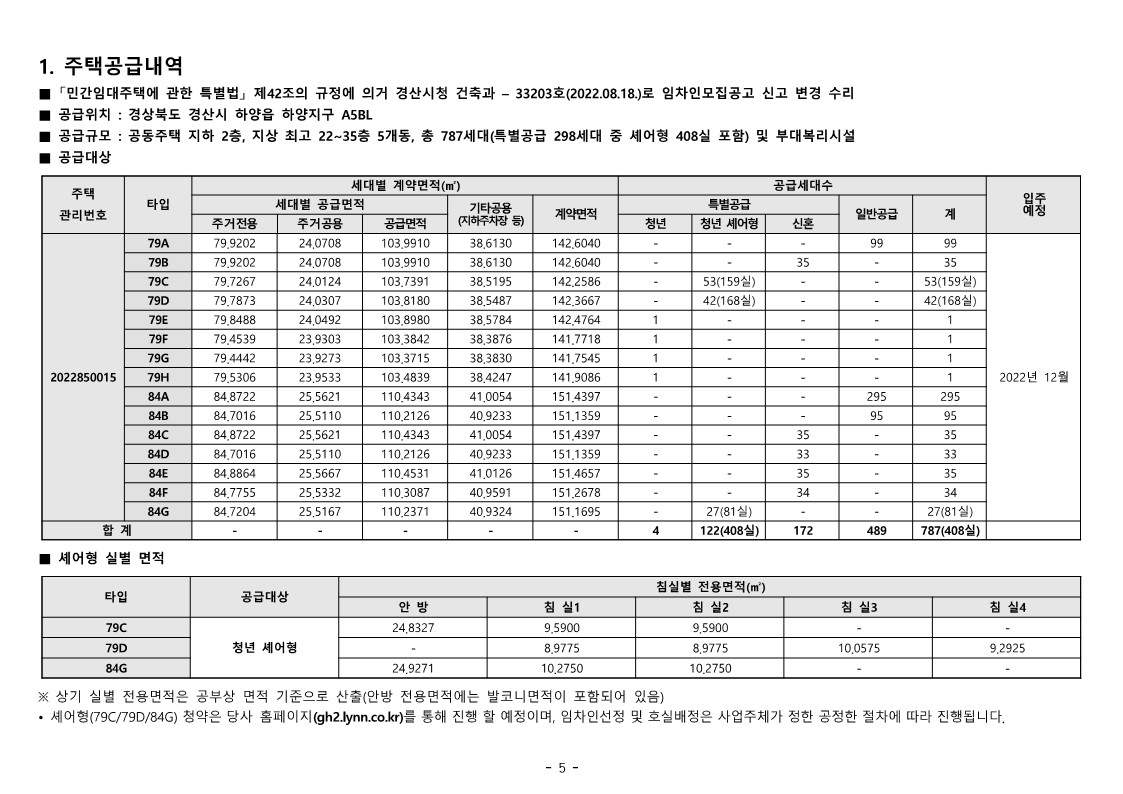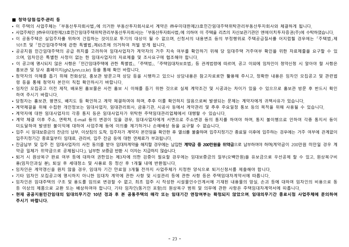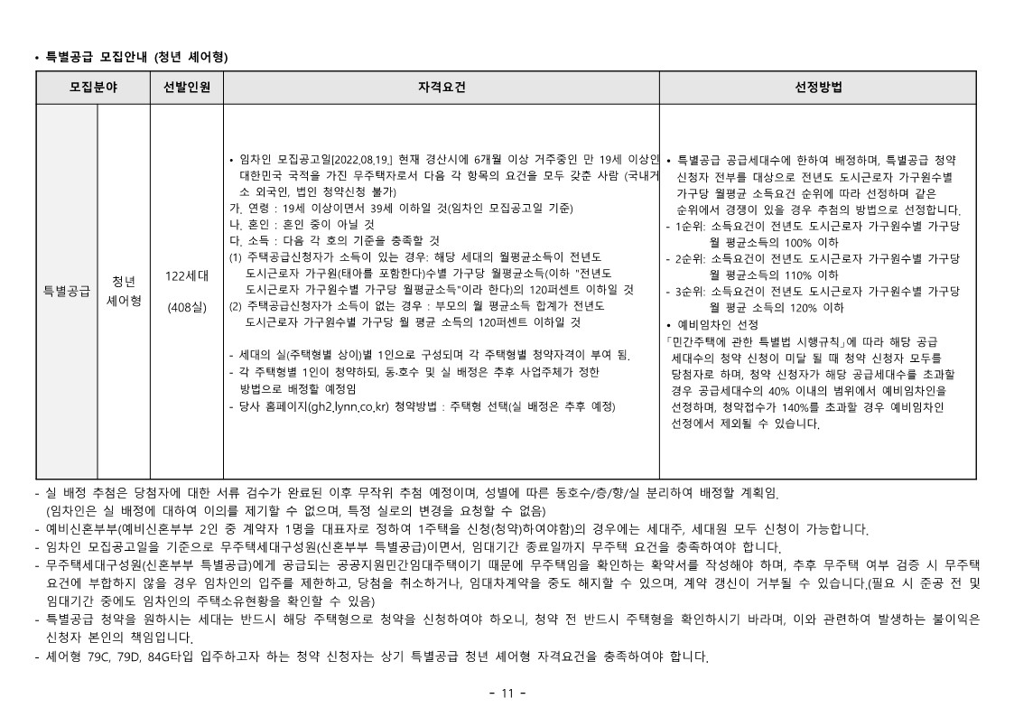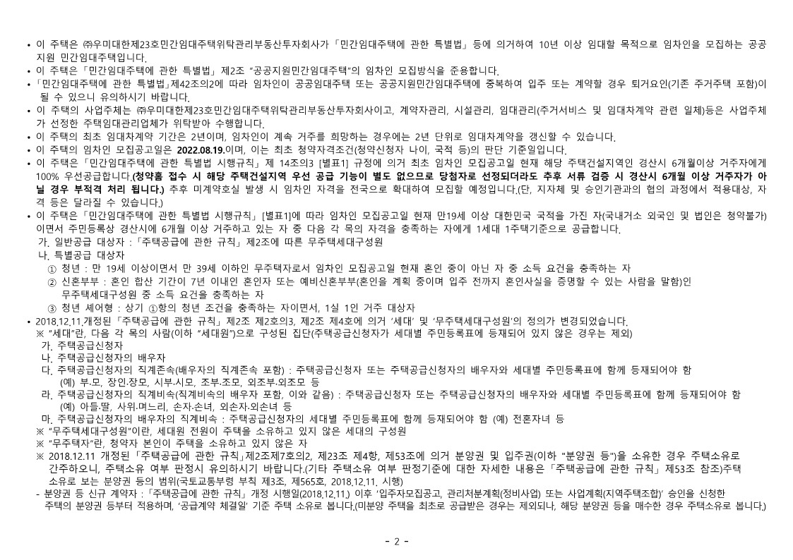 • 이 주택의 임차인 모집공고일은 2022.08.19.이며, 이는 최초 청약자격조건(청약신청자 나이, 국적 등)의 판단 기준일입니다.