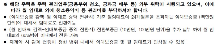 | 임대조건 | • 주택별 임대조건 : 「첨부」주택내역 참조 * 임대조건은 계약 체결 시 변경될 수 있으며, 변경된 경우는 변경된 임대조건으로 계약 체결함 |