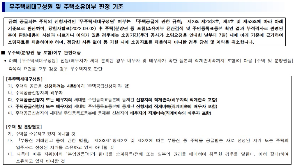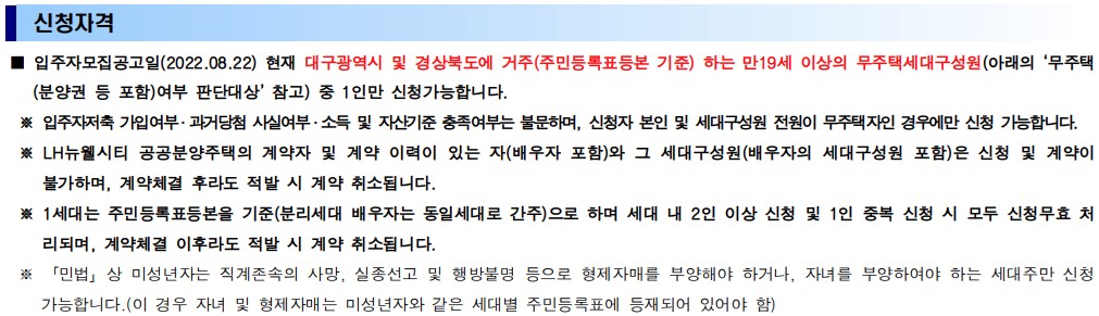 ■ 입주자모집공고일(2022.08.22) 현재 대구광역시 및 경상북도에 거주(주민등록표등본 기준) 하는 만19세 이상의 무주택세대구성원(아래의 ‘무주택(분양권 등 포함)여부 판단대상’ 참고) 중 1인만 신청 가능합니다.