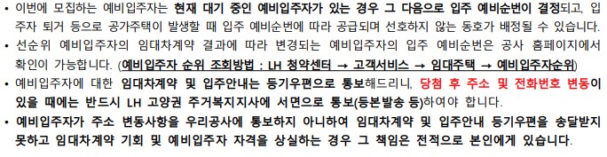 • 예비입주자 당첨 명단은 공사 홈페이지(www.LH.or.kr)와 ARS(1661-7700)를 통해 당첨 발표일로부터 30일간 확인할 수 있으며, 당첨 사실을 확인하지 못하여 계약 체결을 못한 경우의 책임은 신청자 본인에게 있습니다. (당첨명단 조회방법 : LH 청약센터 홈페이지 → 인터넷청약 → 청약결과조회 → 당첨/낙찰자조회)