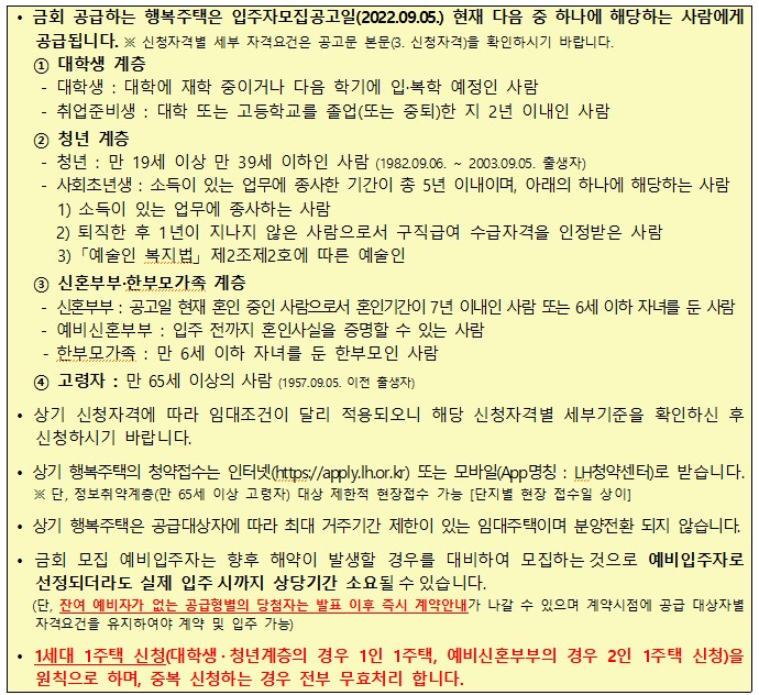 | 임대문의 | • 콜센터 : 전국 대표전화 1600-1004 • 인터넷 - 마이홈포털 (http://www.myhome.go.kr) - 행복주택 공식 블로그 (http://blog.naver.com/happyhouse2u) - LH 홈페이지 (http://www.lh.or.kr) |
