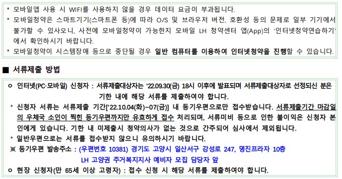 | ‘22.09.21(수) 10:00 ~ ‘22.09.22(목) 16:00 * 인터넷‧모바일 청약신청은 9/21~22 사이 업무시간 외에도 가능 인터넷·모바일 신청만 가능 * LH 청약센터(apply.lh.or.kr) ※ 현장접수 불가 [단, 만 65세 이상 고령자에 한해 접수일 10시~16시 (점심시간 제외) 현장접수 지원, 장소 : LH 고양권 주거복지지사 5층 우측 사무실] |