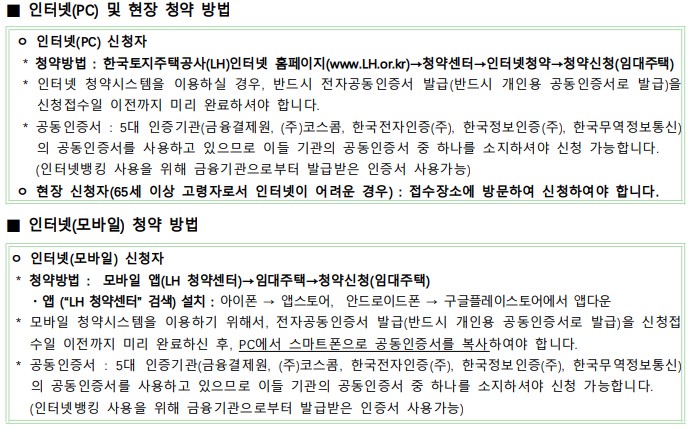 | 인터넷 청약 | • PC : LH 청약센터(http://apply.lh.or.kr) → 인터넷청약 → 청약신청(임대주택) • 모바일 : “LH 청약센터“ 앱(App) 설치 → 임대주택 → 청약신청(임대주택) |
