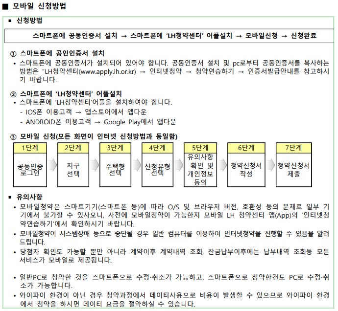 | 인터넷 청약 | PC : LH 청약센터(http://apply.lh.or.kr) → 인터넷청약 → 청약신청(행복주택) 모바일(APP명칭:LH청약센터) → 인터넷청약 → 청약신청(행복주택) |