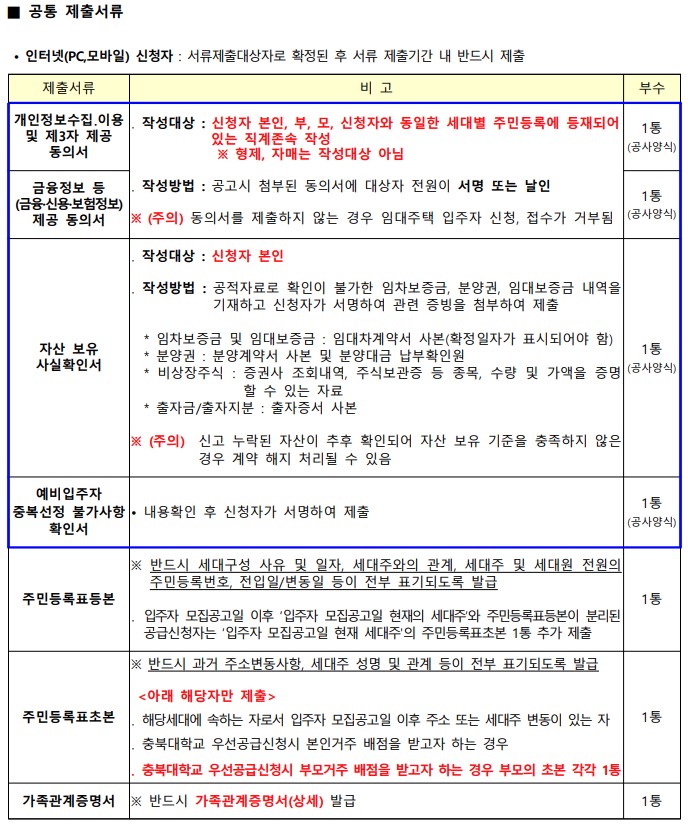 ※ 등기 우편접수 서류제출 대상자 발표일 ~ ‘22.09.27.(화) 우체국 소인분까지 등기 우편접수처 : LH 충북남부권주거복지지사 청주개신행복주택담당자 앞 주소 : (28798) 충북 청주시 서원구 1순환로 1037, 8층) |